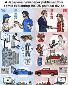 Once you see the two-tribe dynamic as cultural, not just political, you see it in everything, not just politics. The very wide range of associations is obvious even to foreigners: